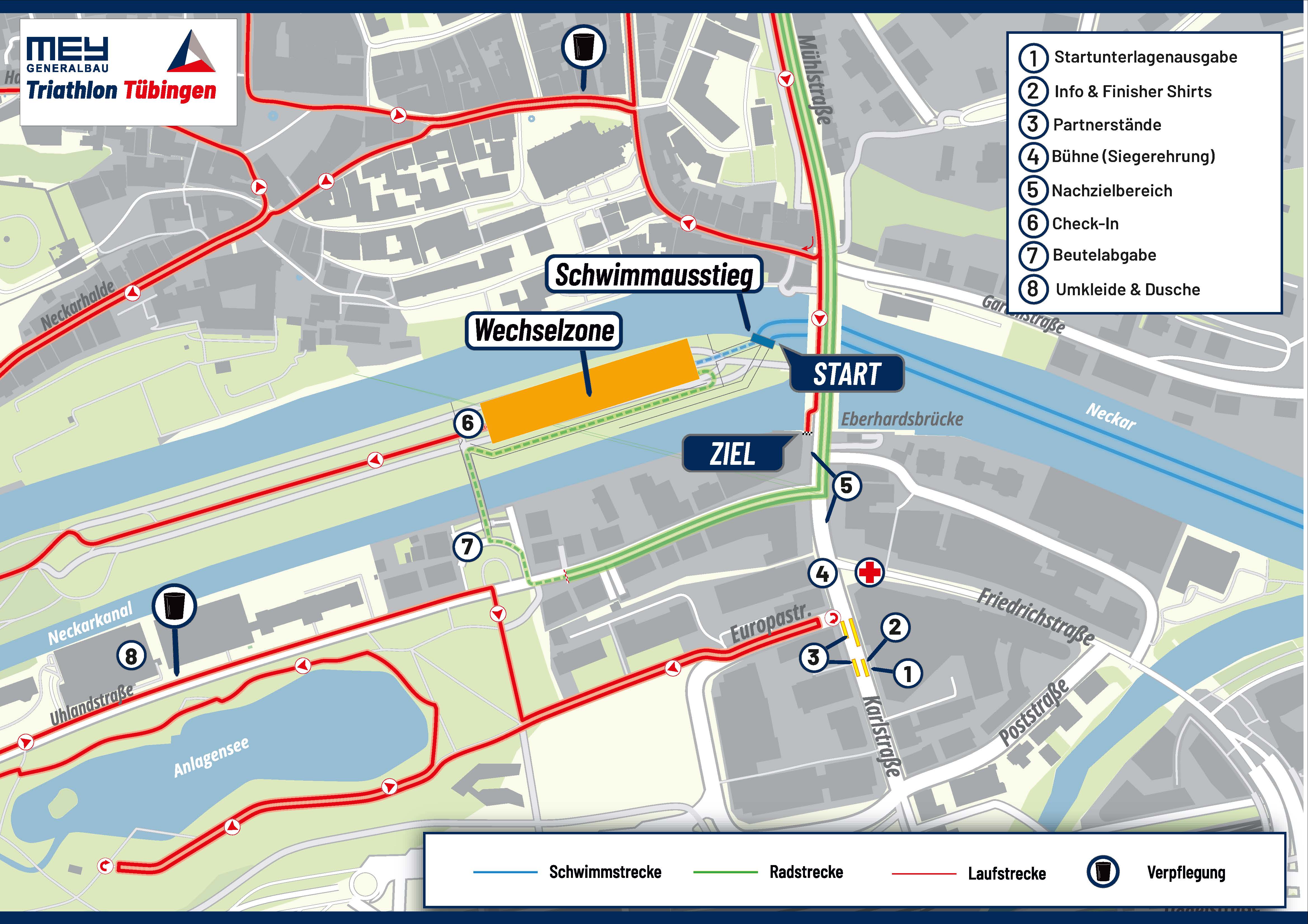 Geschwommen wird im Neckar vor der malerischen Neckarfront. Um Abstände zwischen den Sportler*innen zu gewährleisten, werden wir einen Rolling Start durchführen. Es handelt sich um eine Wendepunktstrecke, die mit Bojen markiert ist. Die Radstrecke verläuft durch den Schönbuch. Die Strecke hat ca. 200 Höhenmeter pro Radrunde. Die Laufstrecke führt euch am Neckar entlang, durch die Tübinger Altstadt und über die Eberhardsbrücke.